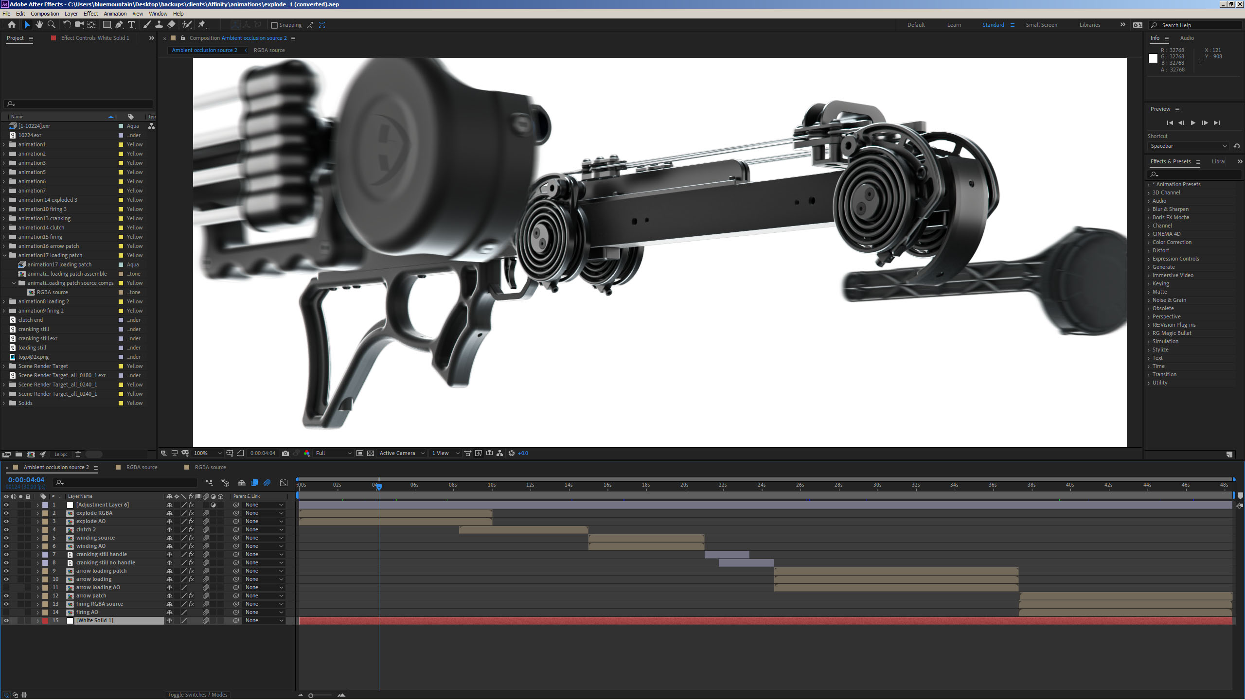 I was asked to take on this very interesting and complicated demonstration, loading and firing sequence of the Lancehead crossbow. This scene was created in 3ds Max along with the mechanical and string simulations, which were very complicated to create. Everything was rendered in Octane, and post production and composition in After Effects CC and Media Encoder CC as 32bit EXR's. The videos might take a few seconds to load.